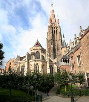10世紀から14世紀に建てられたブルージュを代表する教会。グルートフルーズ博物館に隣接し、メムリンク美術館にも近い。また、レンガ造りの塔は、ブルージュのシンボルの一つとなっています。 この教会の見どころは、南の翼廊に安置されているミケランジェロの彫刻「聖母子像」。イタリア以外の地でミケランジェロの作品を見ることは珍しく、昔、この街の豪商が金貨百枚で購入したものだそうです。 また、教会の内陣の霊廟には、ブルゴーニュ公シャルル突進公の棺と一人娘のマリー・ド・ブルゴーニュの棺が並んで安置されています。美女として名高い「ブルゴーニュのマリー」はフランドル史では忘れてはならない女性であり、今も人々に深く愛されています。