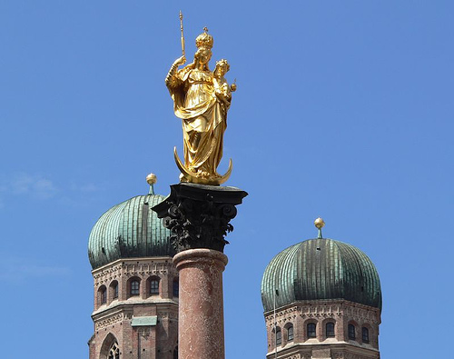 | 17世紀前半、ミュンヘンは「三十年戦争」でスウェーデン軍の占領されました。無事解放された後、選挙侯マクシミリアン1世が神に感謝して建てたのがマリエン広場の中央に建つ「聖マリア像」です。それ以後、バイエルンの守護女神として崇められています |
